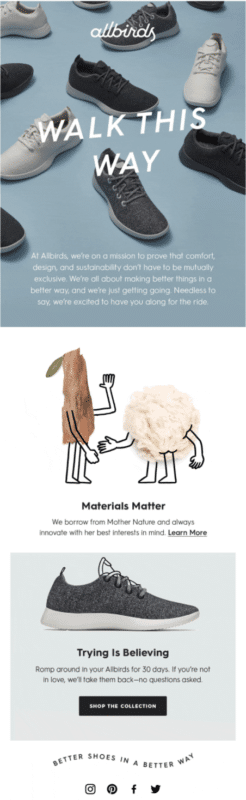 Your second email is a great time to share your brand’s values and what signups can expect to receive from you. This Allbirds welcome email is a great example of how you can share your mission and key values with your subscribers.