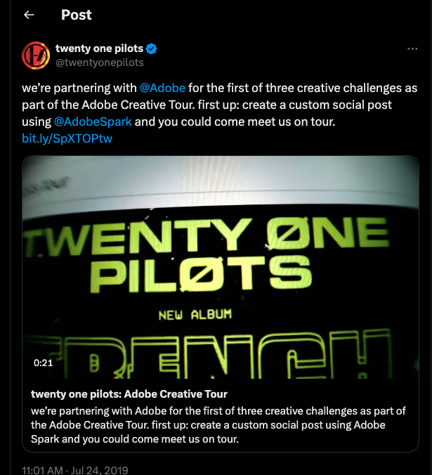 Adobe hosted a creative contest that encouraged Twenty One Pilots fans (primarily made up of a younger demographic) to create a social post using their Adobe Spark application. This partnership fostered an interest in what could easily be Adobe’s future client base, getting them acquainted with their software and, ultimately, their brand.