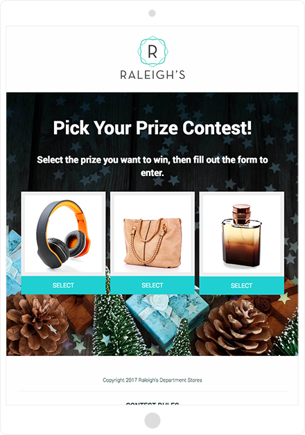 A Pick Your Prize giveaway is a unique type of giveaway that gives your participants the option to select from one of several prizes they’d like to win. The prize selected by each participant can give you a unique insight into the types of products they might like.