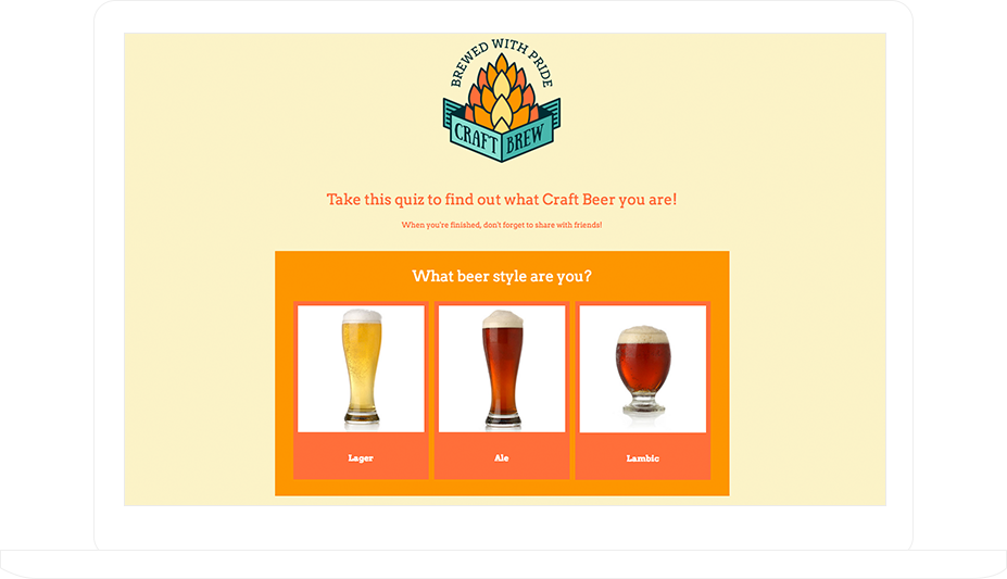 Say you’re a brewery owner. Build a quiz asking, “What kind of craft brew are you?” Based on how the participant answers each question, the outcome could be: IPA, Amber Lager or Irish Red Ale.