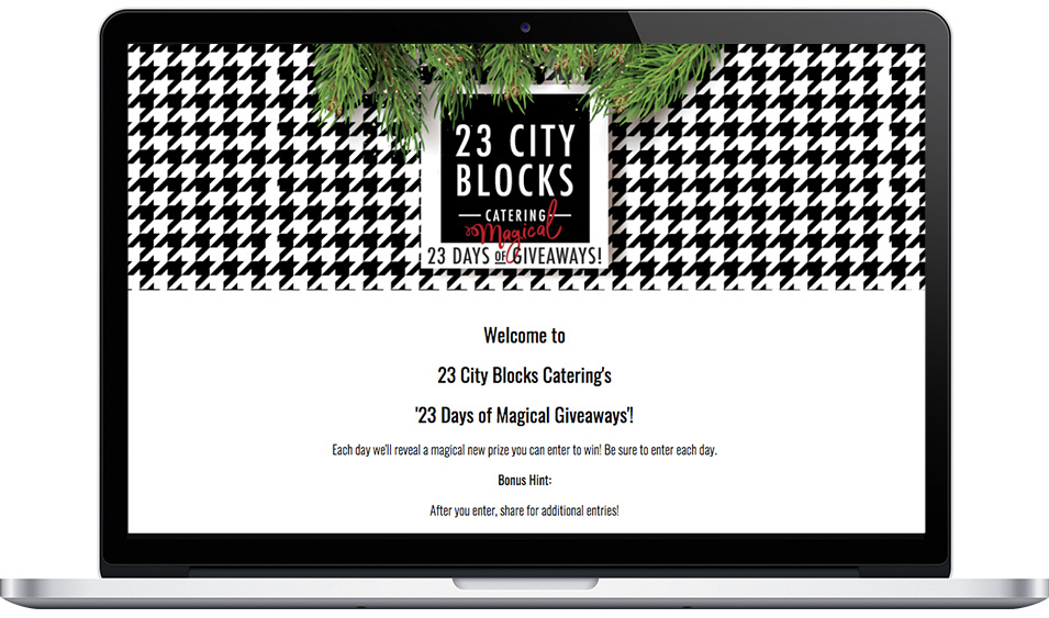 Are you a new company? Multi-day calendars are a perfect way to “yell from the rooftops” about your business. 23 City Blocks Catering created a campaign that does just this, while driving more traffic to their website at the same time. Each day features a culinary- or entertaining-themed prize that was hand-selected by a 23 City Blocks Catering team member. The grand prize, a two-hour happy hour at the winner’s home or business, catered by 23 City Blocks Catering, is the ultimate way to promote their business -- they are giving away their own service!