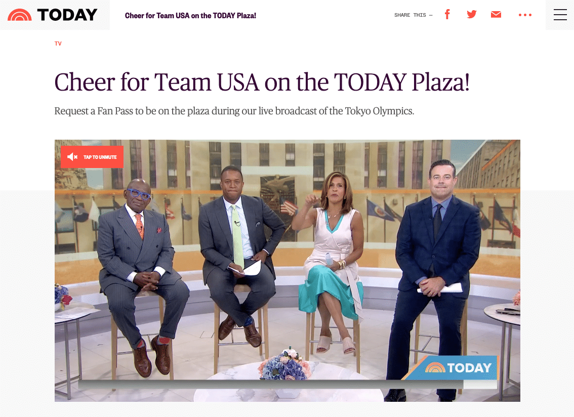 To show their support of Team USA during the Toyko Summer Olympics, TODAY is giving people the chance to enter to win fan passes. Winners can visit the TODAY Plaza with up to three guests to cheer on Team USA during the morning broadcast.The promotion was announced on TV during a TODAY broadcast, while entries were collected via a form on the TODAY website.