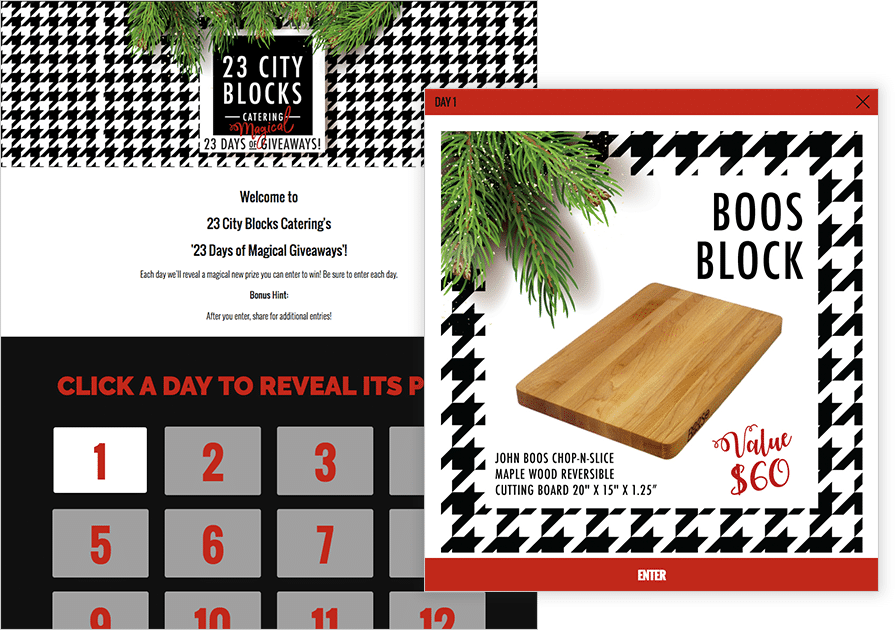 The concept of “gamification” might sound complex, but it doesn’t need to be. For example, 23 City Blocks Catering decided to give away 23 different prizes on 23 different days. Contestants could reveal each day’s prize by clicking on the day on the landing page. This is a crafty way to inspire curiosity and create engagement in a giveaway.
