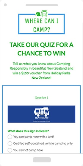 It’s all well and good to get leads from a giveaway, but if they aren’t prospective customers, then what’s the point? Leads and participants are very different things. If you want to get a ton of participants for your contest then give away a holiday or a car. But if you want to generate leads, you need to make the whole experience relevant to your ideal prospects. Everything from the way you market the giveaway to the prizes you offer, should all align with the goals and interests of your target customers.Holiday Parks New Zealand does a great job of qualifying prospects in the example below by using a quiz to narrow potential participants.