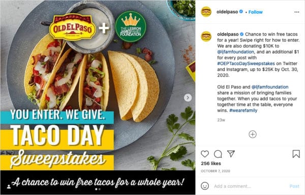 Hashtag contests are the perfect complement to national days since folks are already posting to social media with the day’s hashtag. Old El Paso hosted a National Taco Day #nationaltacoday contest on Instagram. To enter, folks had to post a photo to Instagram of how their family likes to celebrate taco night, tag and follow @oldelpaso, and include the hashtag #OEPTacoDaySweepstakes in the caption. Along with giving entrants the chance to win free tacos for a year, Old El Paso donated $1 for every post to the LeBron James Family Foundation.