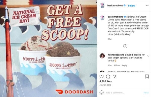 Special offers or discounts can get customers through the door on national days. Baskin-Robbins created quite the stir on National Ice Cream Day #nationalicecreamday by giving away a free scoop. With each Baskin-Robbin’s purchase of $10 or more made through DoorDash, a free scoop was added when the customer included offer code FREESCOOP. This promotion not only made ice cream lovers drool, it also spread awareness of Baskin-Robbin’s delivery options through DoorDash.