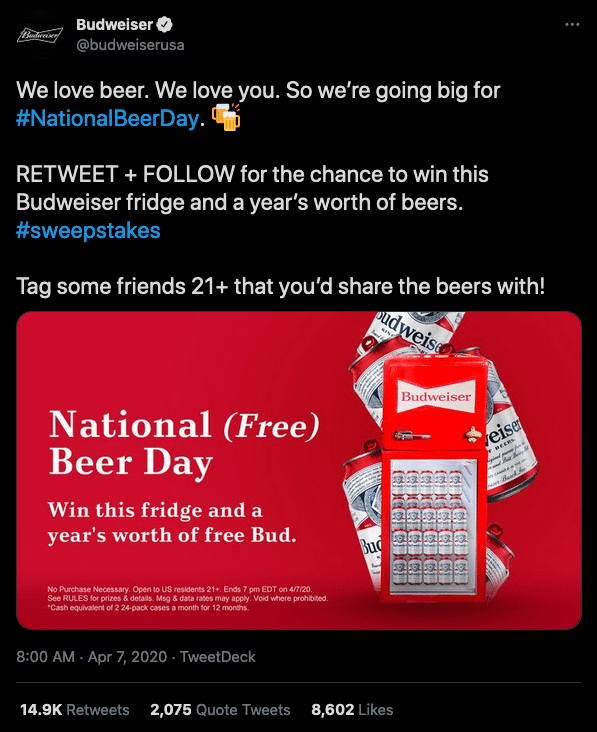Retweet giveaways require entrants to share your brand messaging, a major win for marketers. Budweiser, the self-proclaimed “King of Beers,” naturally hosted a sweepstakes on National Beer Day #nationalbeerday to win a year’s worth of beer and a fridge to store it in. To enter, participants had to Retweet Budweiser’s post, which put their brand in front of a bunch of thirsty beer lovers.