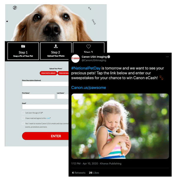 For National Pet Day #nationalpetday, Canon hosted a sweepstakes where pet owners could submit one of the 1000s of pet photos they undoubtedly have for a chance to win Canon eCash. While Canon still used social media to promote their sweepstakes, collecting entries via a landing page allowed them to gather leads. These leads could be used down the road for Canon’s marketing campaigns.