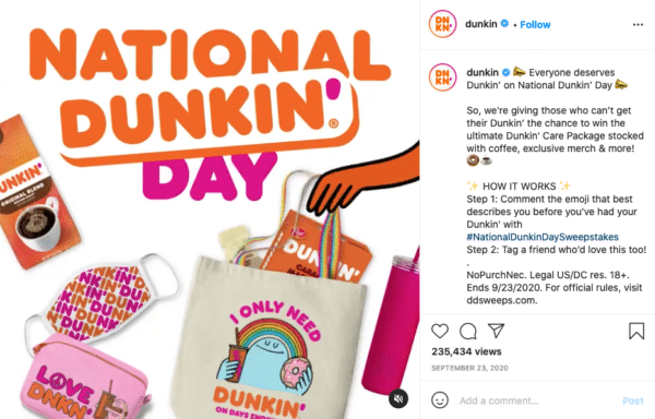 Dunkin’ Donuts knows fans love their coffee so much that they renamed National Coffee Day #nationalcoffeeday National Dunkin’ Day. To celebrate “National Dunkin’ Day,” the brand hosted a comment to enter contest on Twitter. All that was required for entry was leaving a comment on the National Dunkin’ Day post on Dunkin’ Donut’s Instagram profile. Entrants had to comment with an emoji to describe how they felt before they’ve had Dunkin’ coffee, the hashtag #NationalDunkinDaySweepstakes, and tag a friend.