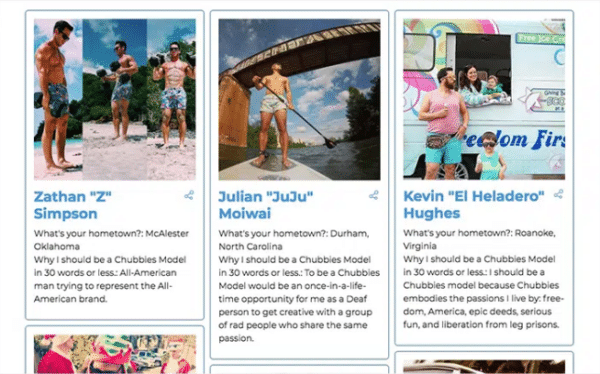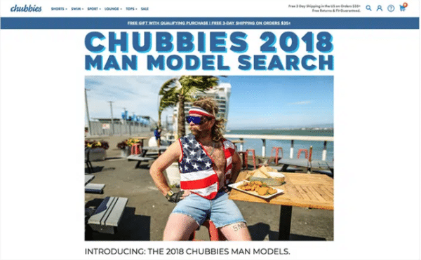 Another popular way to leverage UGC is to scour the collected content to search for your next “face.” Clothing brands such as Torrid, Aerie, and Chubbies have used the power of UGC to turn customers into their best representatives.Take a look at this Chubbies Man Model Search from 2018. The participants may not look like a model you’d see sprawled across a billboard in Times Square, but Chubbies knows their audience and their audience isn’t receptive to chiseled abs and lasered, hairless skin. Instead, the clothing retailer turned to a UGC photo contest and found “real guys” to use as the next face for their brand.