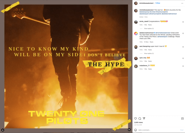 When it comes to digital design, Adobe leads the industry in content-creating software. So, it makes sense that they would host regular art contests allowing their users to explore the capabilities Adobe applications have to offer. This not only helps to create an army of brand loyalists but also builds eye-catching galleries that show off what users can do.When Adobe hosted their Adobe Spark Twenty-One Pilots Art Contest, they did just that. Participants were asked to use the platform as well as some stock elements to create an engaging piece with photography, animations, and a Twenty One Pilots song.This example of UGC not only showcases what Adobe Spark can do, but also helped create awareness for the band.The winning art piece has over 2,600 views on Instagram alone. So, imagine the reach of the collective body of entries.[caption id="attachment_51794" align="alignnone" width="600"]