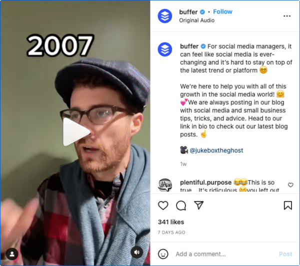 When showing off clever UGC, there’s no need for fancy video editors or ad strategists - leveraging your UGC can be as simple as reposting it.For the marketing team at Buffer, reposts are helping to strengthen their Instagram presence. According to the social media app, “we’ve made reposting a key part of our Instagram strategy and this tactic has helped us to significantly grow our account.”Here’s an example of a repost on Buffer’s Instagram profile: