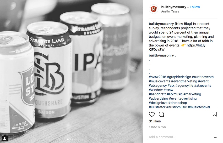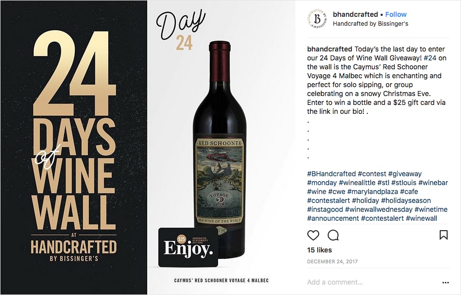 BHandcrafted uses a mix of popular hashtags plus a couple of local hashtags and their own, which they encourage their customers to use.Many brands use hashtags haphazardly, so when there’s someone doing it right, it stands out. In this example, BHandcrafted, a coffee and wine bar in St. Louis, Missouri, uses a mix of popular hashtags (#contest) with a couple of local hashtags (#stlouis) and their own (#bhandcrafted) which they encourage their customers to use.