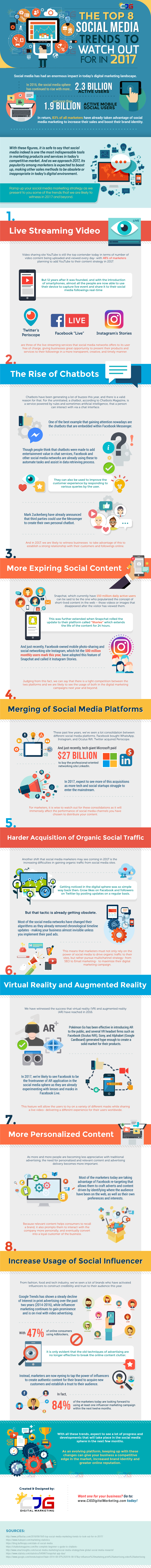 This content discusses the top social media trends for 2017, including live-streaming video, chatbots, and personalized content.