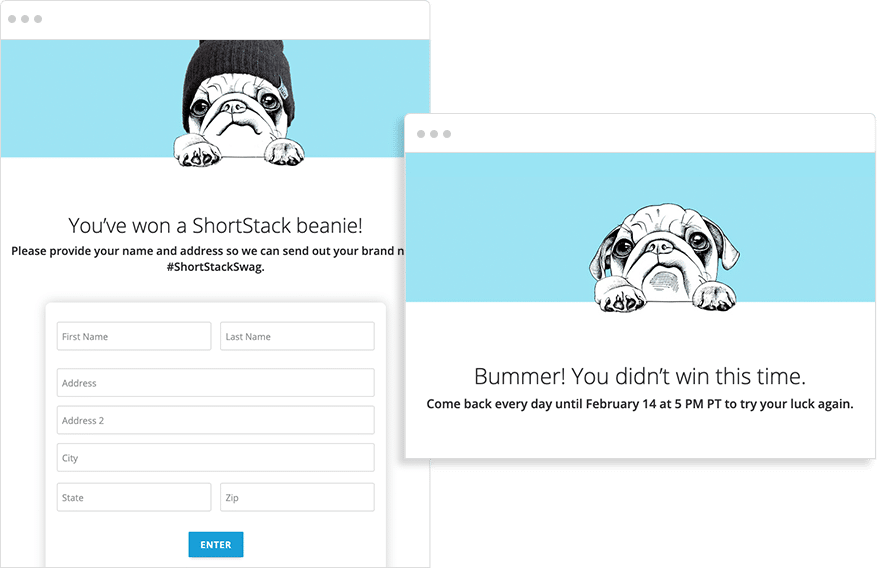 The campaign ran for three days - from February 12th to 14th.Giveaway participation was kept ultra simple - participants submitted their email address into a form to enter. That’s it! If they were selected as a winner at random, a new entry form displayed to collect their shipping info. If they were not selected to win, they saw “try again tomorrow” text.One hundred winners were randomly selected by our Instant Win feature to win a ShortStack beanie.